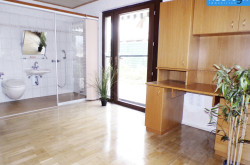 Im Obergeschoss befindet sich ein großer Raum mit Zugang zur Terrasse von wo Sie den Blick über das Marchfeld schweifen lassen können. Dieser Raum bietet vielfältige Nutzungsmöglichkeiten – sei es als zusätzliches Schlafzimmer, Arbeitsbereich oder Hobbyraum.