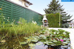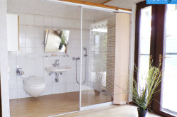 Ein besonderes Highlight des Hauses ist ein weiteres Schlafzimmer mit einem barrierefreien Badebereich und direktem Zugang zur wundervollen Terrasse mit einem idyllischen Teich und Grillplatz. Der Badebereich ist mit einer Dusche, einem WC und einem Handwaschbecken ausgestattet. Eine stilvolle Glaswand trennt diesen Bereich elegant ab.