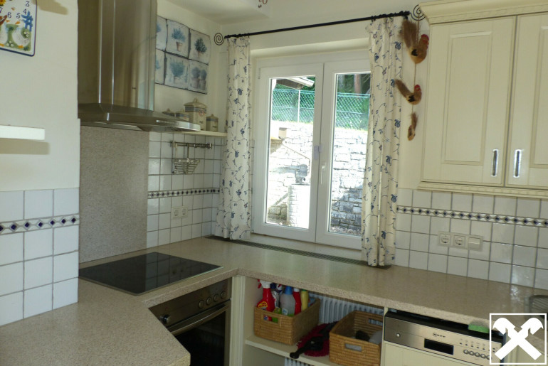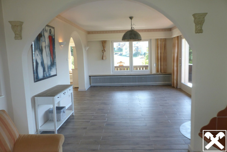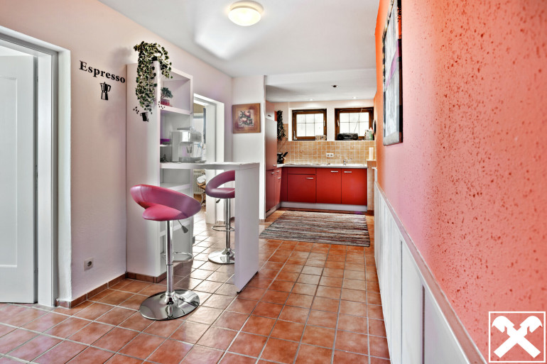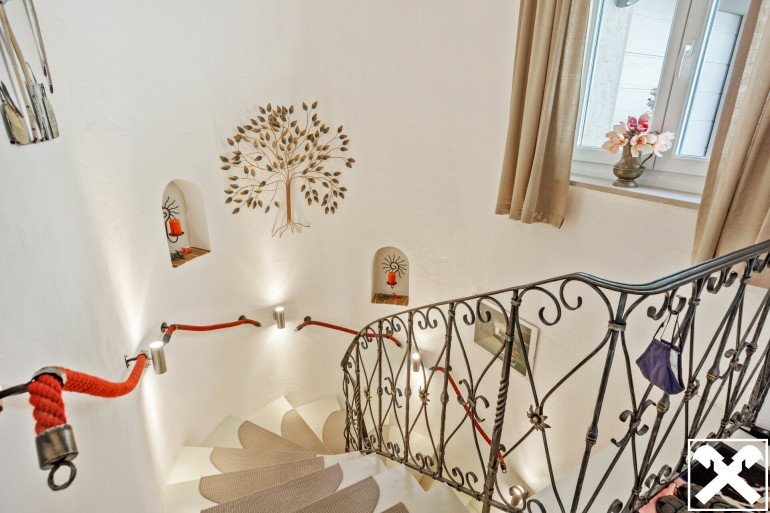 Das Wohnhaus ist teilmöbliert. Die Böden, Wände, zwei Bäder und sonstige Sanitäreinrichtungen, die zwei Küchen und die neuwertigen Isolierglasfenster sind hochwertig. Im großzügigen Wohn-Esszimmer im Erdgeschoß mit Balkonausgang befinden sich ein Holzkachelofen und ein offener Kamin mit Glas-Verbau.