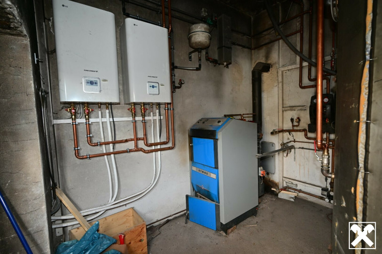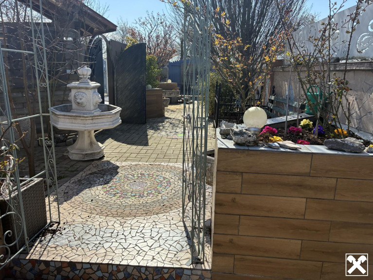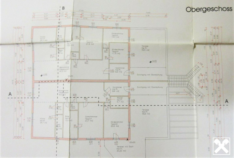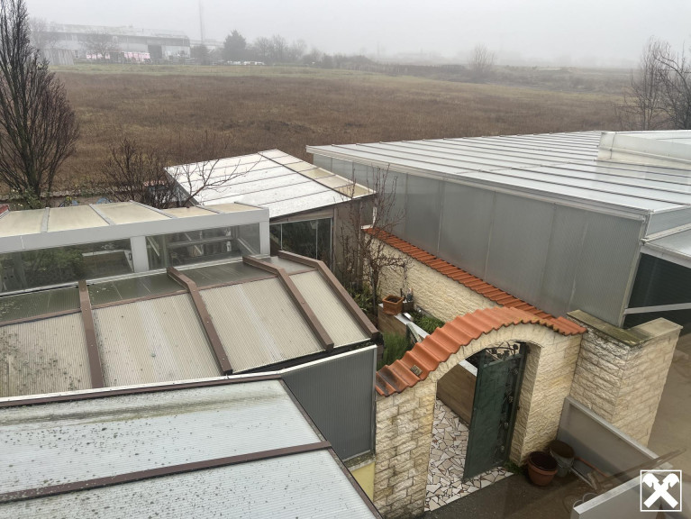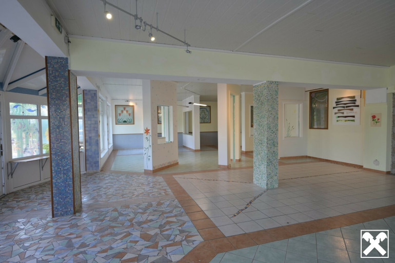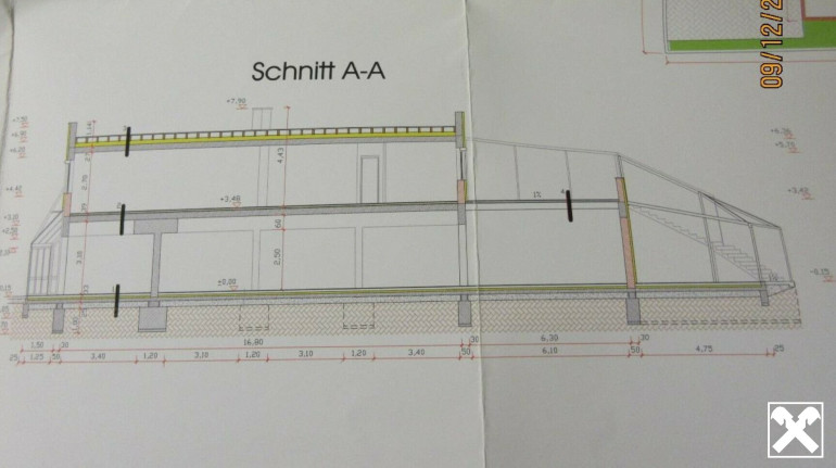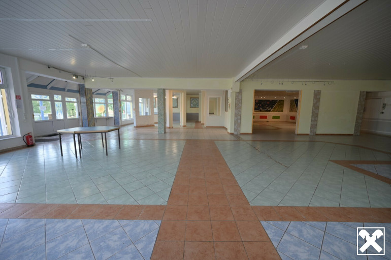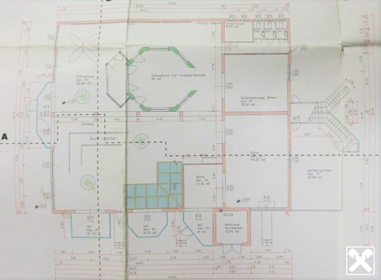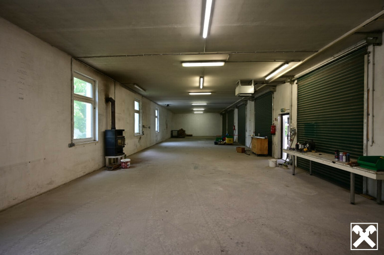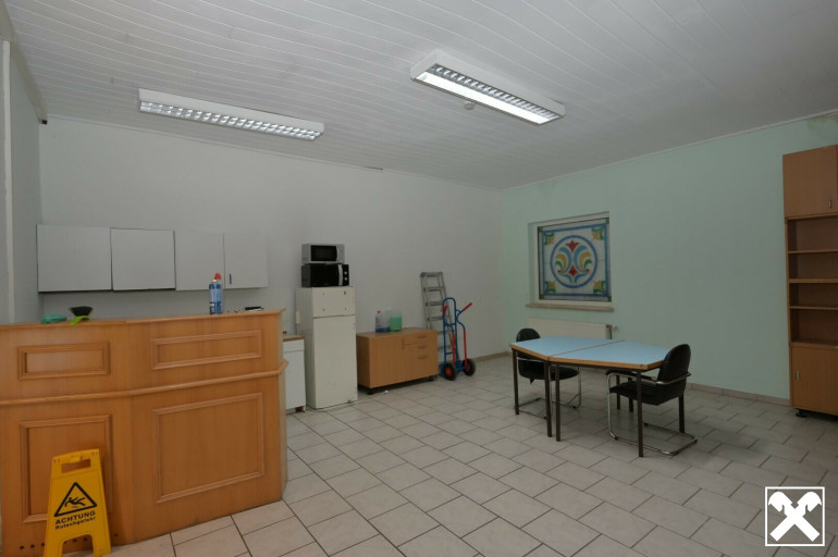 Viel Platz, große Büro/Schauräume, Lager, Parkplätze und 2 große Wohnungen mit je ca. 150m², Terrassen und Garten.