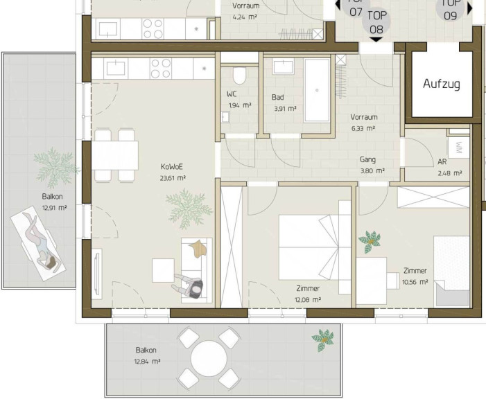 Weiters sind der Wohnung zwei Balkone von rd. 26 m² (Gesamtfläche) mit Süd- sowie West-Ausrichtung zugehörig, welche vom Wohnzimmer und einem der Schlafzimmer aus begehbar sind.
