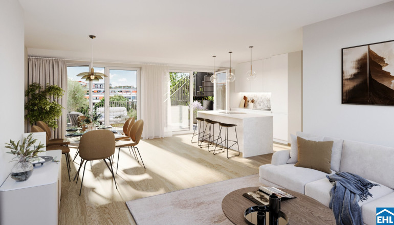 Großzügige private Freiflächen wie Eigengärten, Balkone, Terrassen, Loggien sowie beeindruckende Dachterrassen mit Panoramablick schaffen ein einzigartiges Wohngefühl.