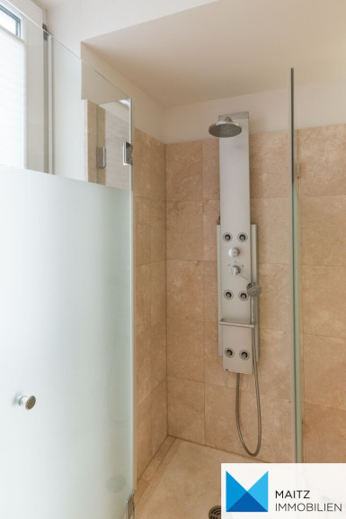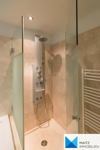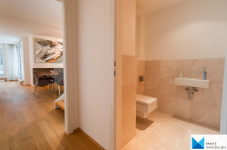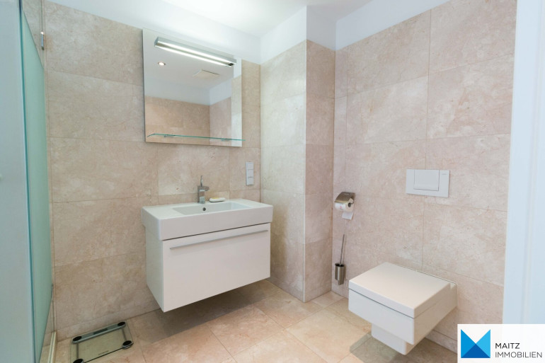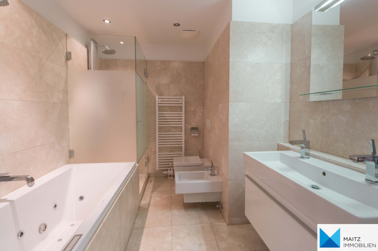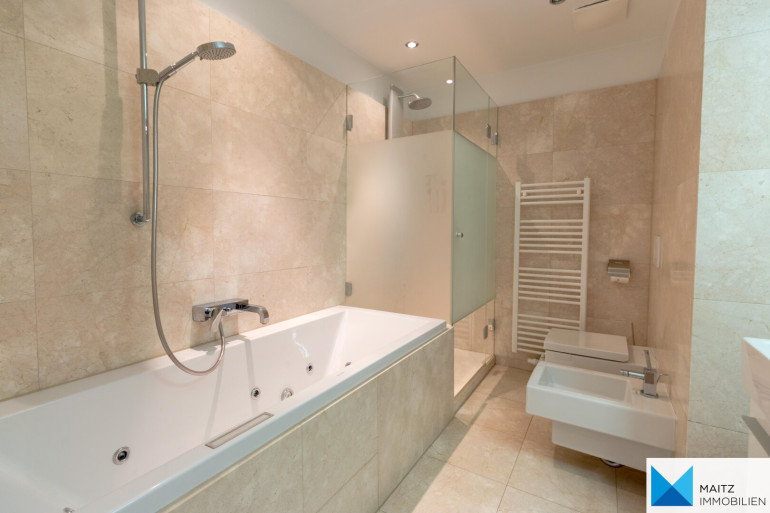 + 2 Marmorbäder mit hochwertiger Keramik und Design-Armaturen, großflächigen Spiegeln im Bereich der Waschtische, Handtuchtrockner mit E-Patrone für Sommerbetrieb und elektrischer Fußbodenheizung;