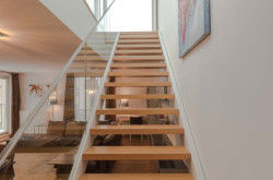 Auf die Dachterrasse mit rund 89m², deren südliche Hälfte mit einem elektrisch ausfahrbaren Sonnensegel beschattet werden kann, führt eine Designstiege mit Glasgeländer im Wohnzimmerbereich.