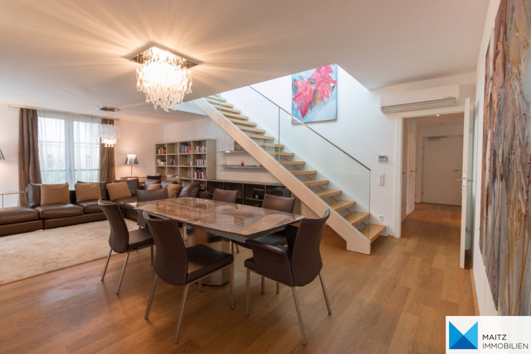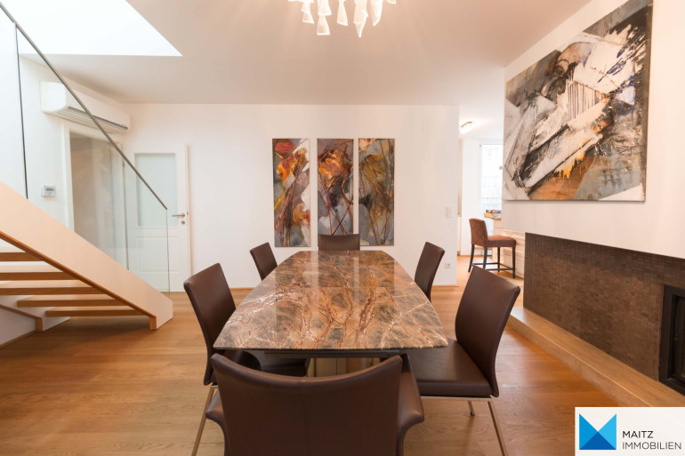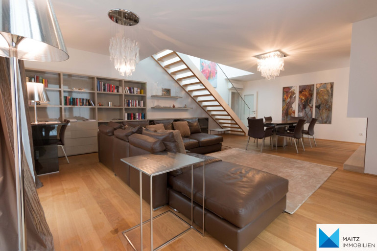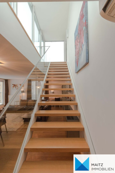 Zur Wohnung gehört gehören eine Terrasse auf Wohnebene und eine XXL-Dachterrasse, beide zur exklusiven Verwendung.