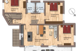 Im Obergeschoss befindet sich eine weitere Wohnung mit eigenem Wohnraum, einer Küche, drei Schlafzimmern und zwei Bädern. Diese Wohnung verfügt über einen separaten Zugang und eignet sich daher ideal zur Vermietung.
