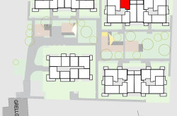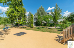 Fahrradräume sind im Kellergeschoss, Kinderwagenräume im Erdgeschoss verfügbar. Die Anlage hat auch einen großen Kinderspielplatz.