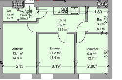 Vorraum, WC, 3 Zimmer, Küche (möbliert), Bad mit Wanne.