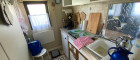 - Küche mit Spüle, Elektroherd und Kühlschrank