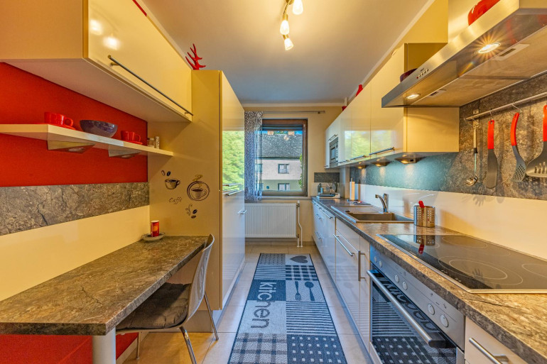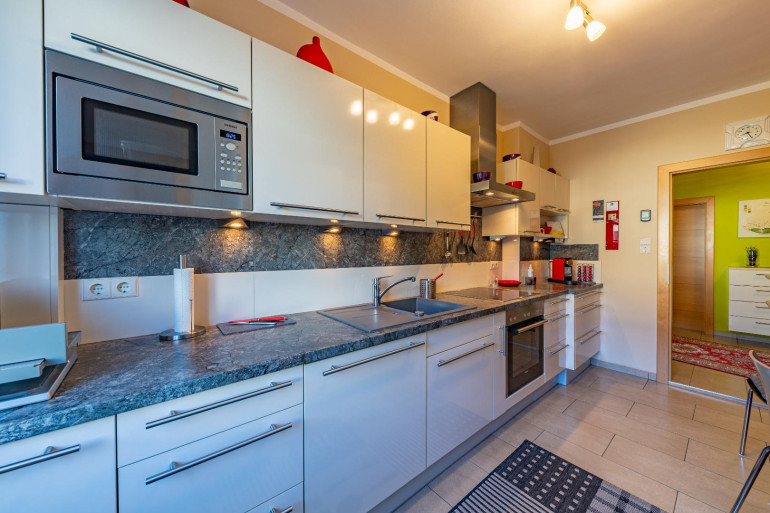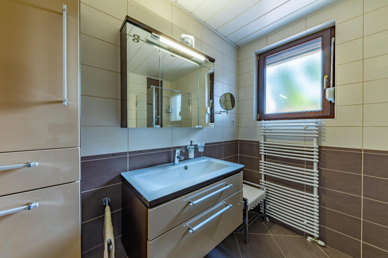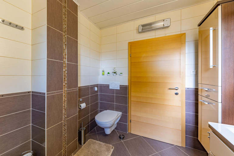 Das Erdgeschoss dieses Wohnbereiches bietet eine kompakte Küche, ein Gästezimmer mit Dusche sowie eine große Diele/Wohnzimmer/Partyraum. Auf dieser Etage befinden sich noch ein Abstellraum, eine Toilette & ein Technikraum. Ergänzt wird dieser Bereich mit einer großen Garage sowie einem Stiegenaufgang in das Obergeschoss. Hier, im Obergeschoss findet man einen lichtdurchfluteten Wohnbereich, eine moderne Küche und ein weiteres Schlafzimmer mit Zugang zum Wintergarten und zur großen Terrasse. Das moderne und geräumige Badezimmer sowie die Toilette runden das Angebot auf dieser Etage hervorragend ab.