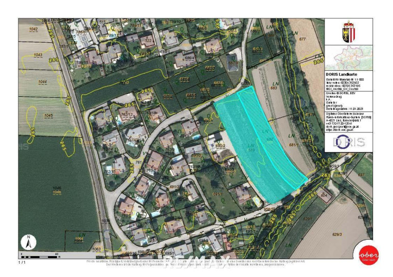 Das Grundstück weist derzeit noch eine Grünlandwidmung auf. Es liegt aber bereits ein Grundsatzbeschluss des Gemeinderates für eine Umwidmung in Bauland-Wohngebiet vor. Auch gibt es bereits eine mögliche Bebauungsstudie für eine enggruppierte Bebauung mit 6 Doppelhäusern