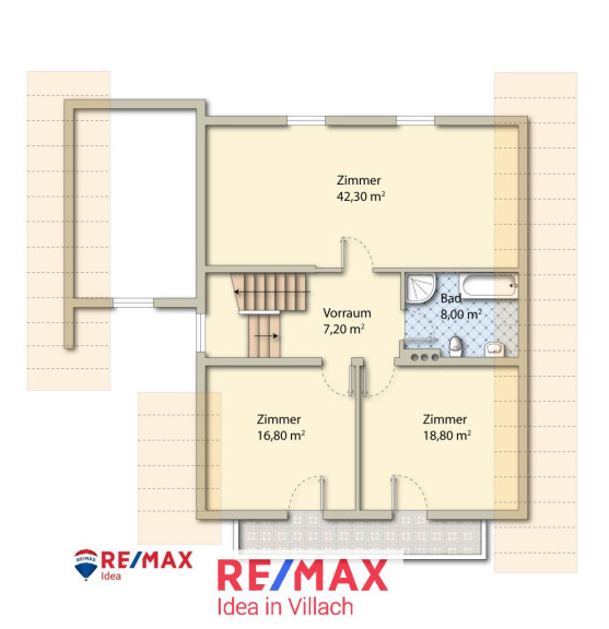 * OG: Vorraum, 2 Zimmer mit Balkon, 1 riesiges Zimmer, Bad mit Badewanne, Dusche und WC