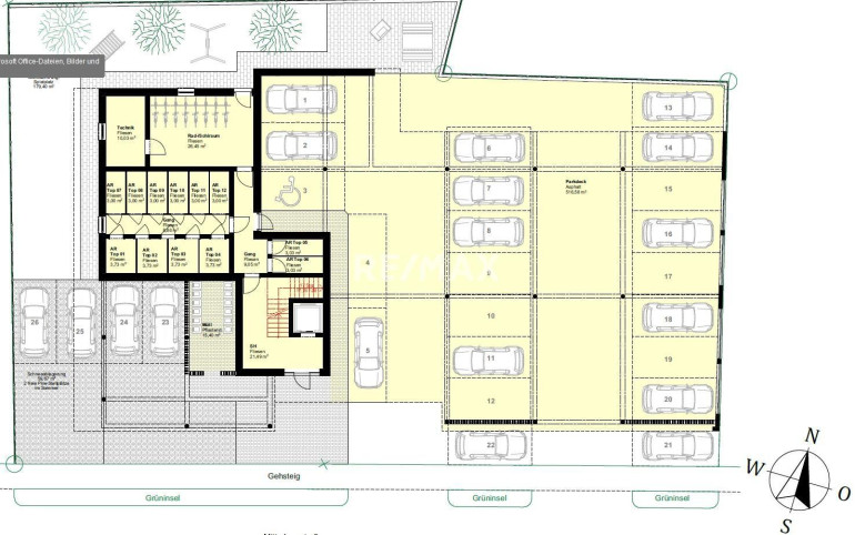 jeweils sechs im 1. Obergeschoß und im 2. Obergeschoß. Das Erdgeschoß besteht aus einem Parkdeck mit genügend Parkflächen sowie