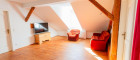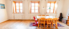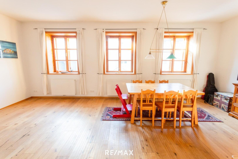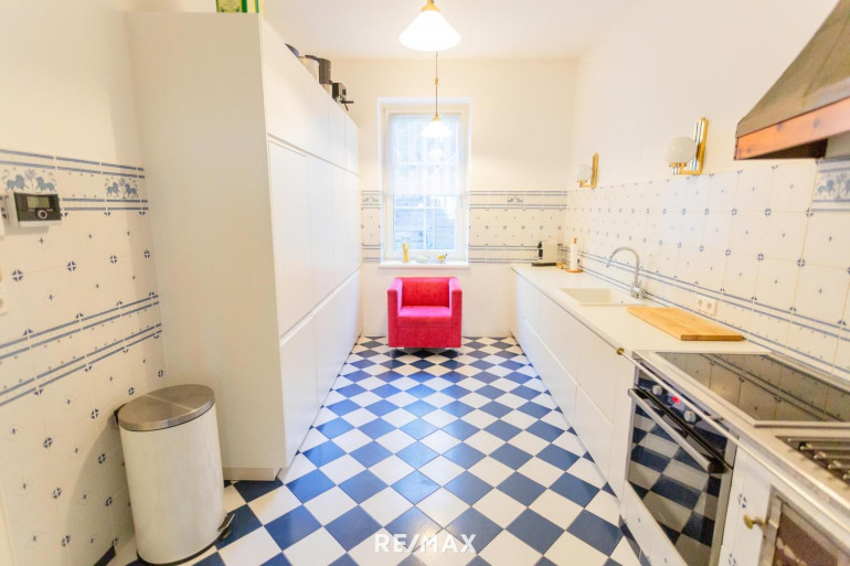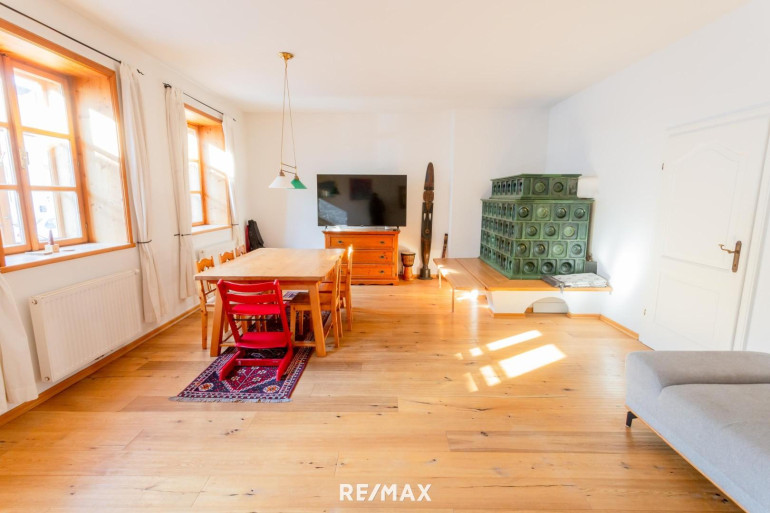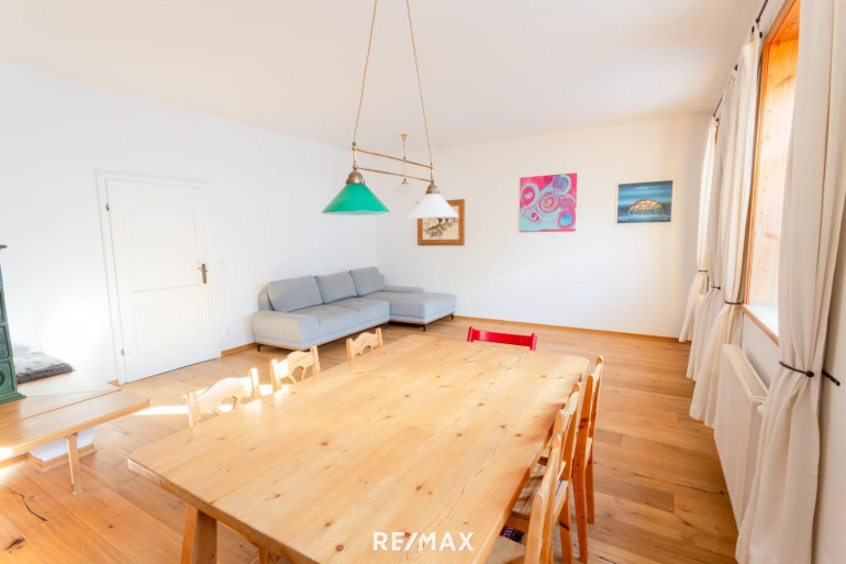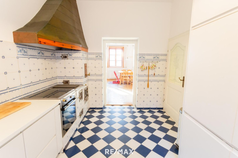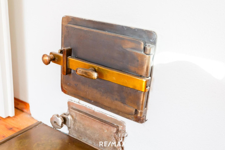 Der Charme dieser Wohnebene spiegelt sich in vielen Details wie Holz-Kastenfenstern, den von Meisterhand gesetzten Kachelöfen, Holzdielenböden und in den in Handarbeit gefertigten Küchen- sowie Treppenfliesen wider.