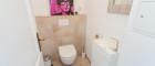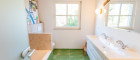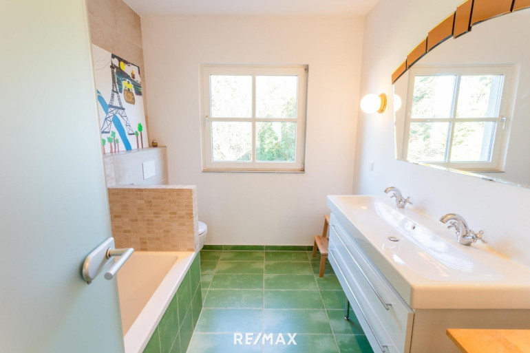 - Ein Bad mit Wanne, Doppelwaschbecken, Fenster, WC