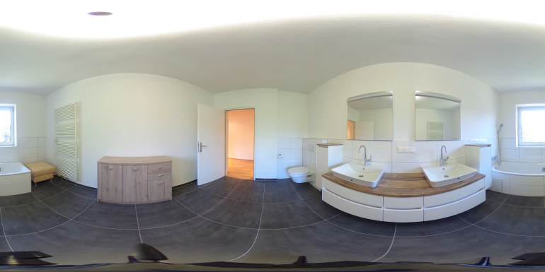 - 1 Badezimmer mit Wanne, Doppelwaschbecken und WC
