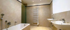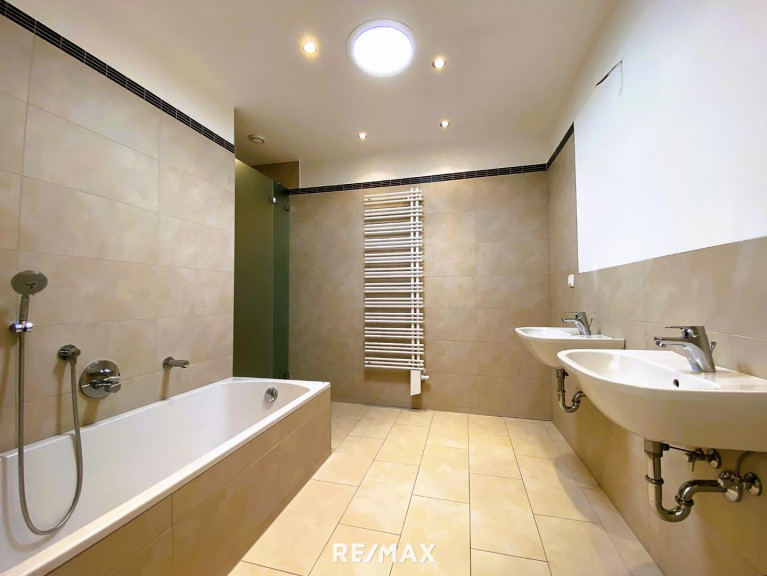 + Badezimmer mit Doppelwaschbecken, Dusche, Badewanne und Handtuchtrockner