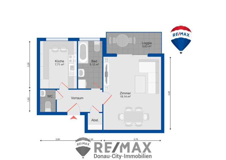 Vom Wohnzimmer aus gelangt man auf die 6m² große Loggia die zum entspannen einlädt.