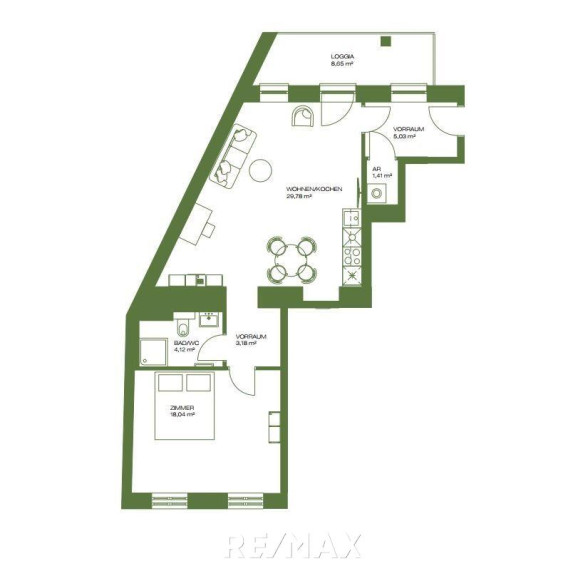 geräumige Wohn-Küche ca. 30 m² und Zugang zur ca. 9 m²-großen Loggia;