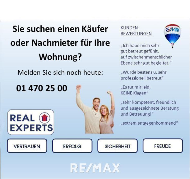 Für eine Terminvereinbarung und weitere Informationen stehen wir Ihnen gerne unter 01/ 470 25 00 oder office@remax-real-experts.at zur Verfügung.