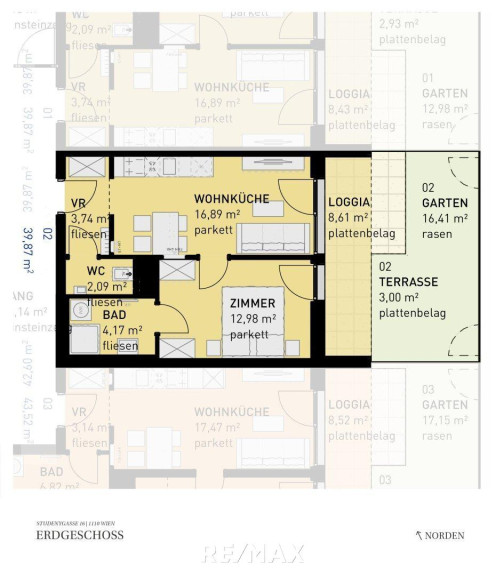 Die Wohnungen haben eine Größe zwischen ca. 39 und 62 m² mit zwei bzw. drei Zimmer, modernen Grundrissen und Freiflächen (Garten, Loggia, Balkon oder Terrasse).