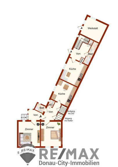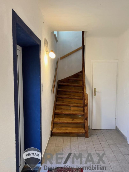 Die Aufteilung: mit einigen Stufen gelangen Sie ins Erdgeschoss mit dem sehr geräumigen Vorzimmer, Küche mit Essplatz, Bad mit Dusche, extra WC und 2 Zimmer. In jedem Zimmer befindet sich ein Holzofen. Das Gebäude hat aber auch eine Gastherme mit Heizkörper. Der Dachboden ist mit einer Holztreppe erschlossen. Wir befinden uns hier schon in der Dachschräge, aber der offene sogenannte LOFT - artige Raum bietet viele Möglichkeiten. Auch hier befindet sich ein Holzofen. Das Haus ist teilweise unterkellert. Die Gasthermen für beide Häuser befinden sich diesem Keller. Elektrisch und heiztechnisch sind beide Objekte getrennt. Verbunden sind sie nur mit einer Wand.
