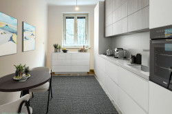 Die Küche, mit Fenster , bietet einen angenehmen Blick in den grünen Innenhof – der perfekte Ort, um beim Kochen ein wenig Natur zu genießen.