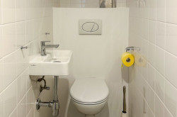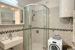 Neben dem WC, im Eingangsbereich, finden Sie das ansprechende Badezimmer mit Dusche, Waschmaschinenanschluss und Warmwasserspeicher.