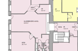 - SIEHE PLAN IN ROSA | OG: bis ca. 2,60 m Raumhöhe, mit Innenstiege zum EG verbunden, großzügiger Empfang, Abstellräume, Büro-/Besprechungsräume (tlw. open-space), Spints, Teeküchen, getrennte Sanitäreinheiten, Terrasse