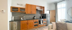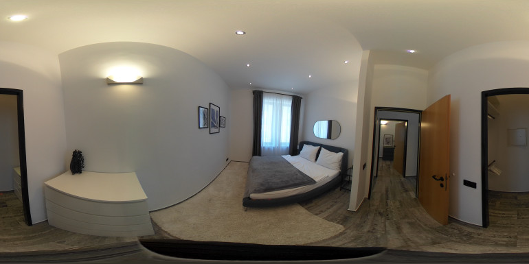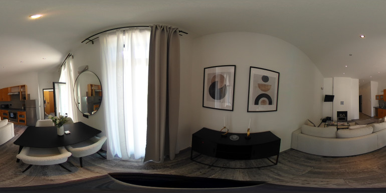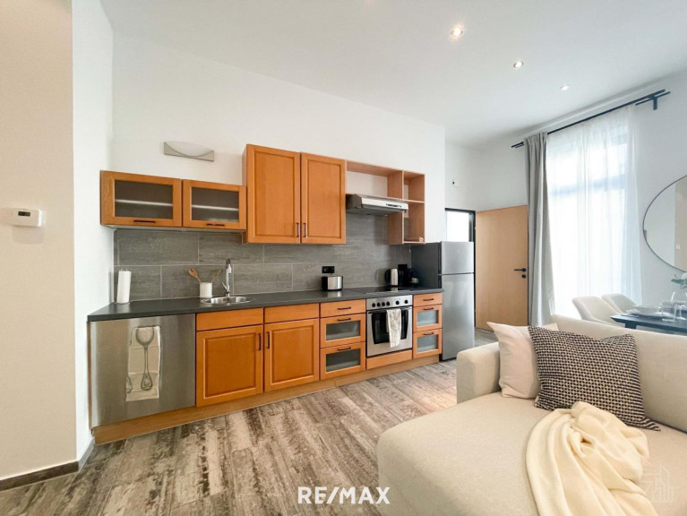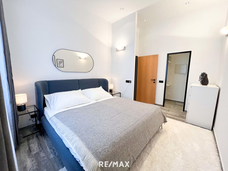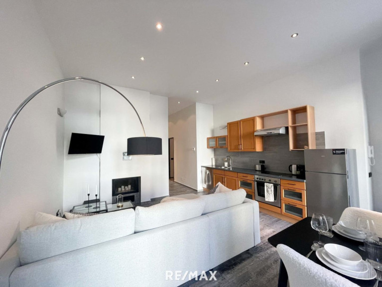 Die Wohnung ist aufgeteilt in ein großflächiges Wohnzimmer mit einer offenen Küche, sowie zwei Schlafzimmer, eines der Schlafzimmer ist mit einem Schrankraum ausgestattet, ein Badezimmer mit Badewanne und einem separaten WC.