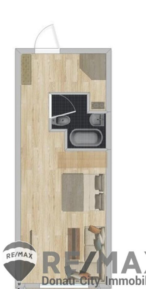 Vom Vorraum aus gelangt man zentral in alle Zimmer. Die Wohnung verfügt eine rund 3 m² große Miniküche, ein knapp 4,5 m² großes Bad inklusive Badewanne und Toilette und das rund 20 m² große Wohn-, Schlafzimmer, welches über ein großes Fenster verfügt und den zentralen Lebensmittelpunkt darstellt.