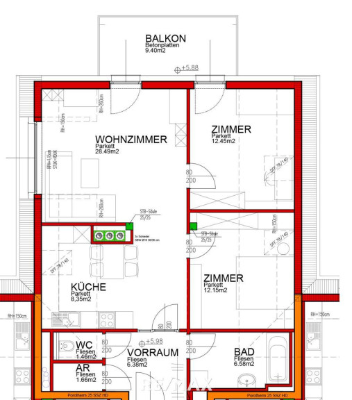 * Vorraum, Küche, Wohnzimmer, 2 Zimmer, Bad, WC, Abstellraum