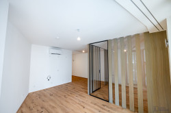 Durch den kompakten Flur gelangen Sie in das Wohnzimmer mit offener Küche, das auf einen Balkon mit Blick auf den Innenhof führt. Dies ist der perfekte Ort für einen morgendlichen Kaffee oder einen entspannten Abend nach einem anstrengenden Tag. Das Schlafzimmer ist durch ein interessantes Designer-Element, elegante Lamellen, die Tageslicht einlassen und dem Wohnraum viel Luft geben, vom Wohnzimmer abgetrennt.