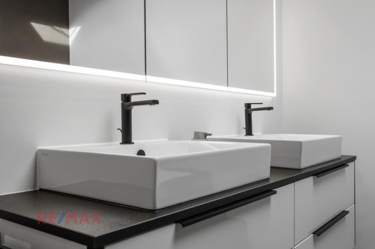 Die moderne Küche ist ein wahres Highlight und wird alle Hobbyköche begeistern. Zwei integrierte Weinkühlschränke halten Ihre besten Tropfen stets perfekt temperiert. Im eleganten Badezimmer sorgt die LED-Beleuchtung mit verstellbarer Farbgebung für eine Wellness-Oase, die Ihnen Entspannung pur bietet.