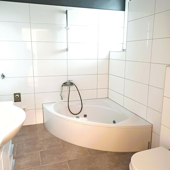 - Bad mit Handtuchwärmer, Eckbadewanne, Mobiliar, Fenster
