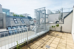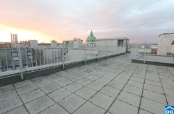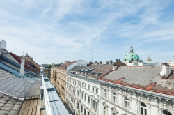 Ein weiteres Highlight ist die großzügige, etwa 52 m² große Dachterrasse, eine Etage höher, die schöne Momente verspricht wie etwa stimmungsvolle Sonnenuntergänge oder einen Blick auf die wunderschöne Karlskirche im Abendlicht.