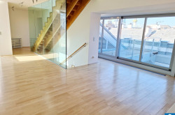 Über eine Holzstiege erreicht man das 2. Dachgeschoß, das über ein etwa 53 m² großes Studio mit Blick auf den Wohnbereich und ein weiteres Schlafzimmer verfügt. Hier erwarten Sie zudem zwei Terrassen, die wie geschaffen sind, den Morgen zu begrüßen oder den Tag in Ruhe zu beschließen. Das Studio bzw. die Galerie sorgt für Leichtigkeit in dieser schönen Wohnung.
