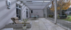 Küche, Esszimmer und Wohnzimmer mit voller Glasfront und Zugang zum Wintergarten