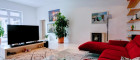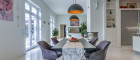 Der Speisebereich geht in den eleganten Wohnraum mit Kamin über.