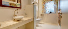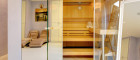 Vom Wohnbereich und dem Wintergarten erreicht man den Spabereich mit Sauna, Rundbadewanne, Dusche, Waschbecken und Ruhezone. Eine geräumige Toilette bietet zusätzlichen Komfort.