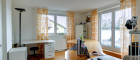 Die obere Etage verfügt über zwei Schlafzimmer, ein helles Büro sowie ein weiteres Bad mit Dusche, WC und dem Zugang zur Dachterrasse.