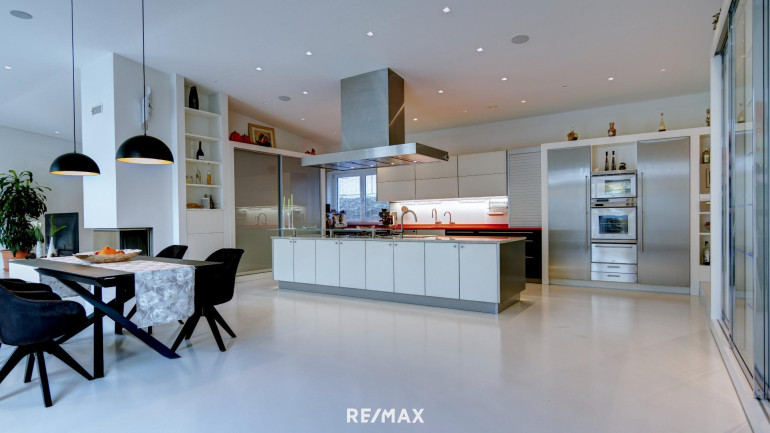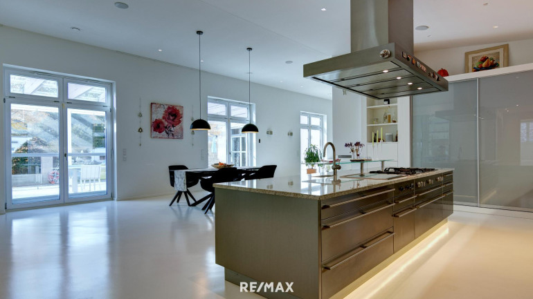 Der modern gestaltete Koch- Essbereich ist mit einer freistehenden Küche der Marke „Gaggenau“ ausgestattet die jeden Komfort bietet.