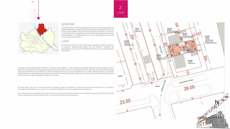 Dieses baubewilligte Grundstück in der begehrten Pastorstraße im 21. Wiener Gemeindebezirk Floridsdorf ist bereit für den sofortigen Baustart! Hier haben Sie die einmalige Gelegenheit, ein modernes Wohnprojekt in einer attraktiven Nachbarschaft umzusetzen, in der sowohl Natur als auch städtische Infrastruktur ideal harmonieren.