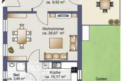 Im Erdgeschoss mit einer Nutzfläche von ca. 100 m² findet man: Flur, Vorzimmer mit Ausgang zum Balkon, Schlafzimmer, größeres Bad inkl. WC, Wohnzimmer, Küche, kleineres Bad mit WC und zwei (Kinder)Zimmer.